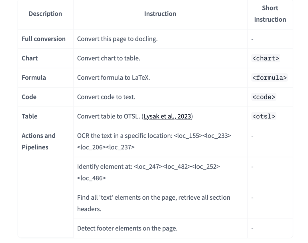 来看文档多模态进展,Granite Docling 258M,基于IDEFICS3 架构,VIT采用siglip2-base-patch16-512(https://huggingface.co/google/siglip2-base-patch16-512)与 Granite 165M LLM,https://huggingface.co/ibm-granite/granite-docling-258M,https://docling-project.github.io/docling/#features,针对不同的ocr任务,采用不同的instruction: