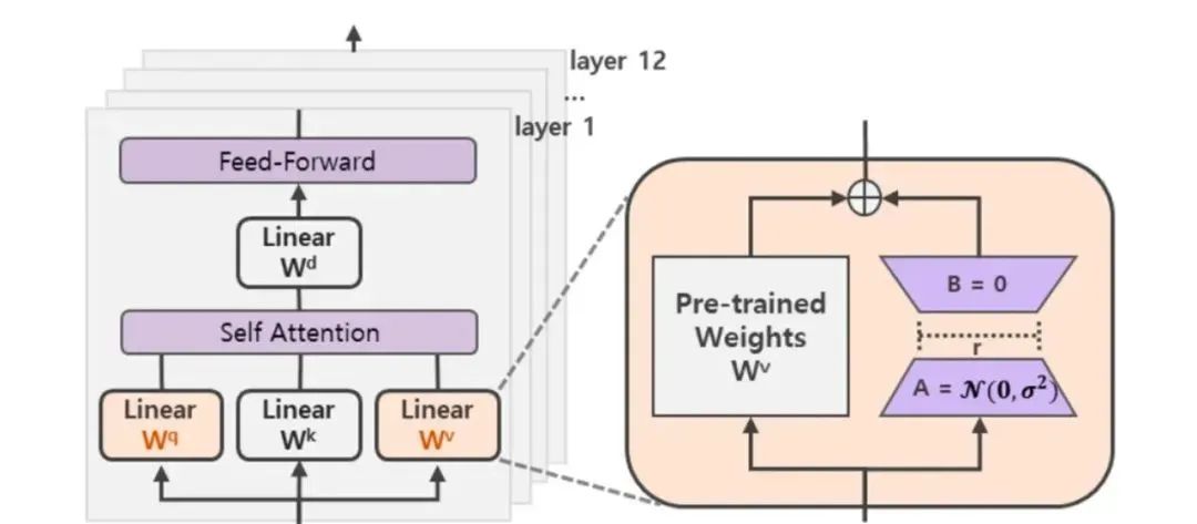 此外,Transformer的权重矩阵包括Attention模块里用于计算query, key, value的Wq,Wk,Wv以及多头attention的Wo,以及MLP层的权重矩阵,LoRA只应用于Attention模块中的4种权重矩阵,而且通过消融实验发现同时调整 Wq 和 Wv 会产生最佳结果。