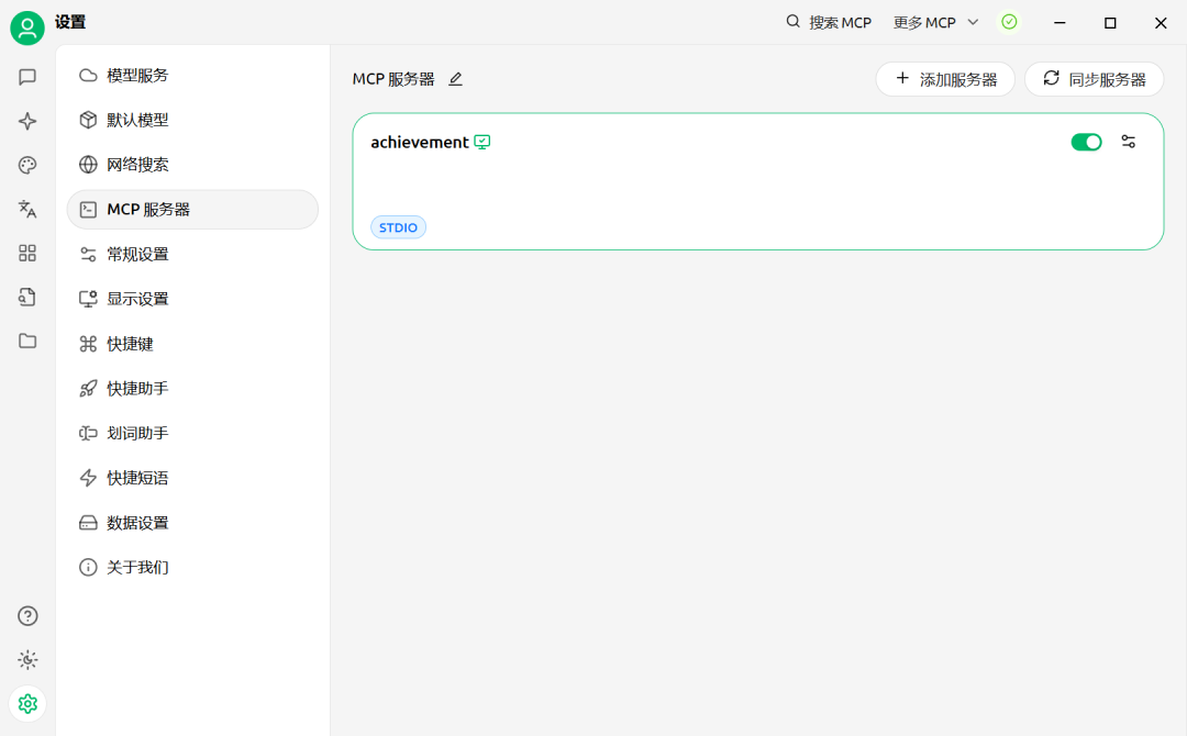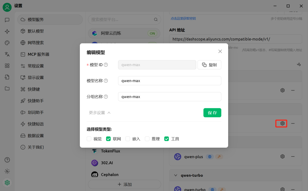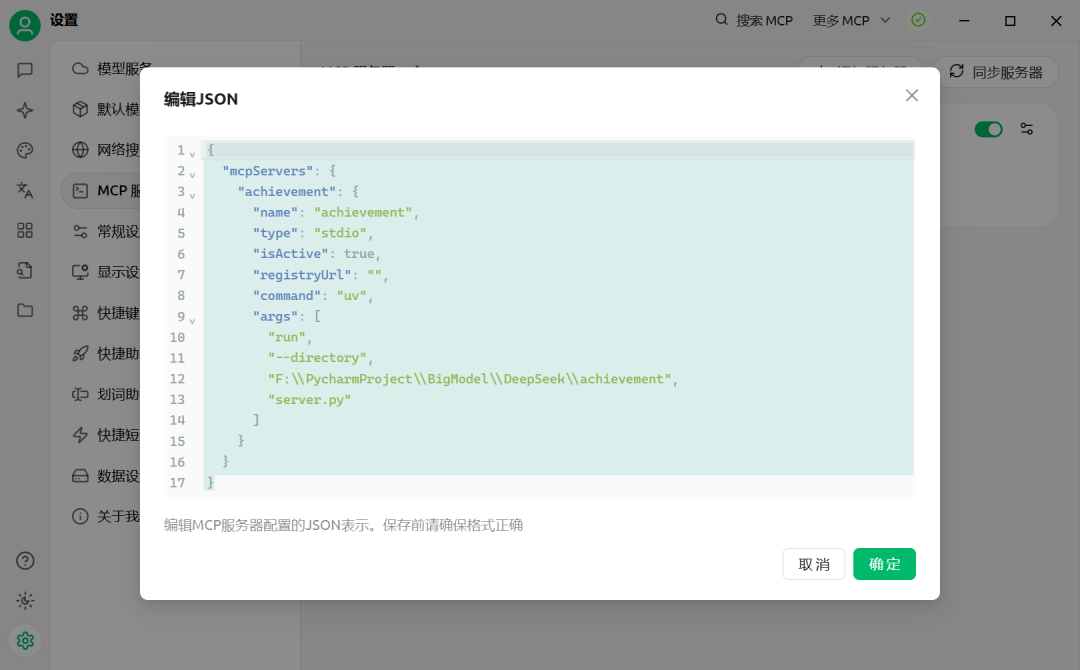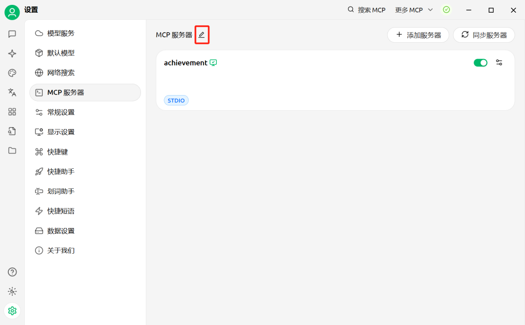 设置好模型后,选择MCP服务器,首先点击右上角的图标,配置好相应的工具。