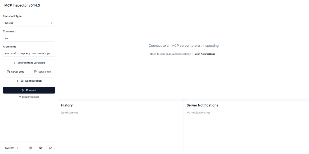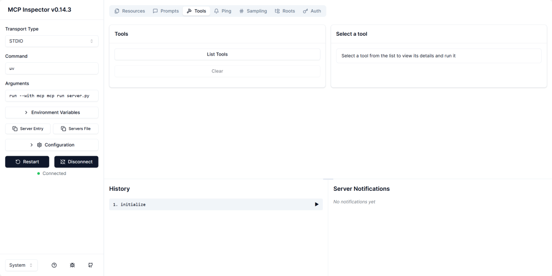 由于我们的MCP Server是在本地运行的,因此Client也需要采用Stdio模式来进行连接。