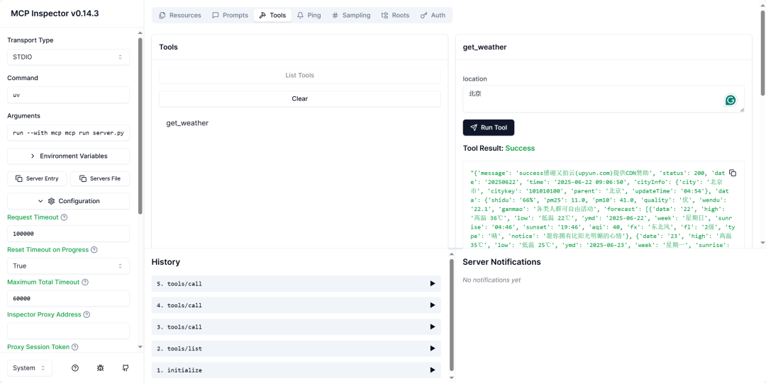 进入到Tools选项中,点击List Tools即可列出当前可用的工具列表:get_weather,选择该工具后,右侧就会出现该工具需要输入的参数,这里我输入了北京,为了能够获取输出,需要在左侧的Configuration中将Request Timeout参数更改为100000,否则会显示超时。