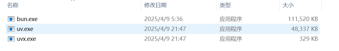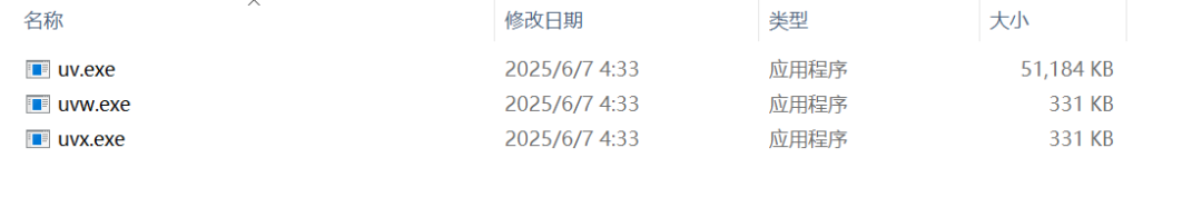 我们可以到uv官网下载安装包,依据自己的开发平台找到对应的版本,windows64一般选择如下版本:uv-x86_64-pc-windows-msvc.zip。将该压缩包解压到指定目录后,会得到如下三个文件: