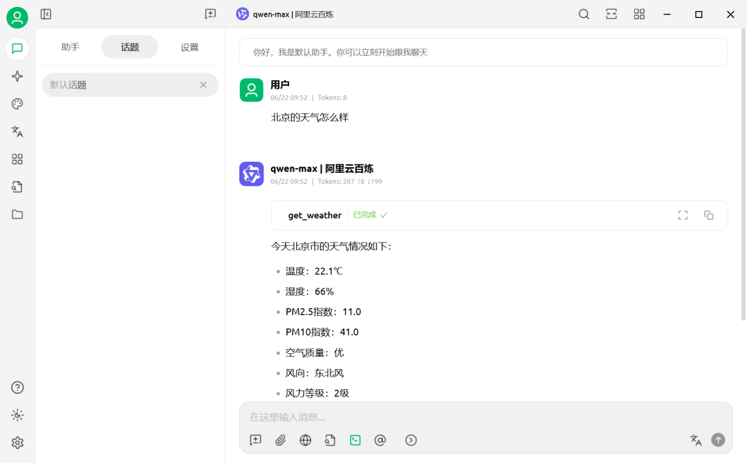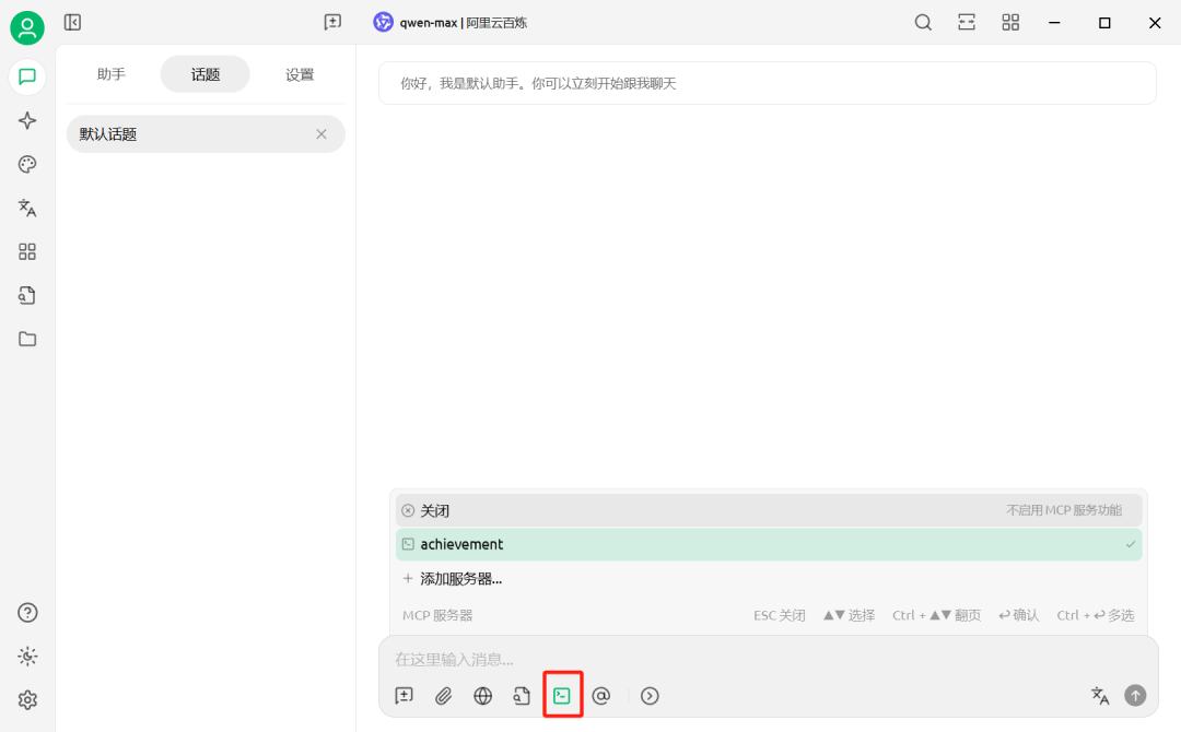 此时,再回到对话界面,选中我们已经连接的MCP Server,模型我用的是阿里云百炼的qwen-max。