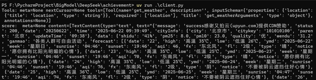 我们输入问题:北京的天气怎么样,模型便可自动调用MCP Server中的工具,并将结果反馈给我们。