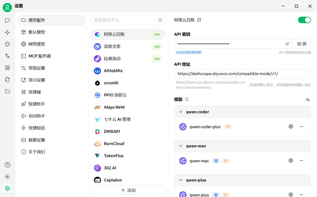 安装完成后,为了更好地使用模型,首先进入左下角的设置界面,选择模型服务,可以照图中的一样将阿里云百炼、深度求索、硅基流动设置好。设置过程很简单,把申请的API密钥填写后点击检测,成功后将右上方的开关开启即可使用。