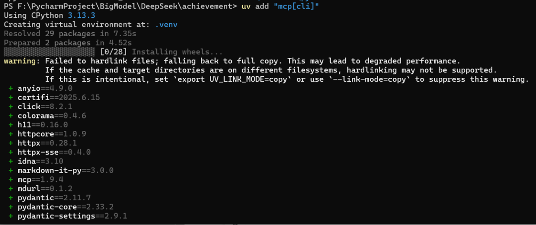 然后我们可以进入到achievement文件夹中,执行如下命令安装mcp包。