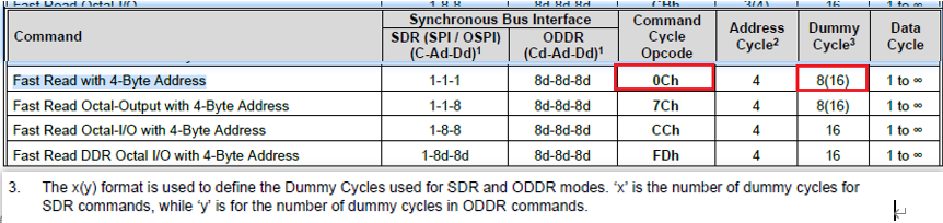 此外对于Dummy cycle数值也可能不一样的,也就是前面提到的“Latency Field“。图5中的8(16)表示如果是SDR模式的话,Dummy cycle是8,如果是DDR模式的话,Dummy cycle值是16。