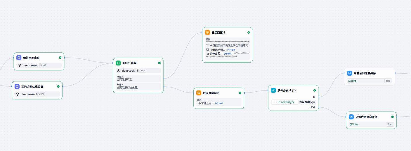 前期为了专注于合同生成,减少意外风险,所以可以在开始节点后加入判断节点,如果用户输入的内容不是合同类型,则提示用户输入要生成的合同类型,减少随意输入带来的各种问题。