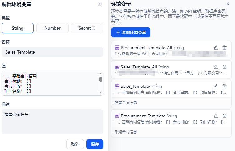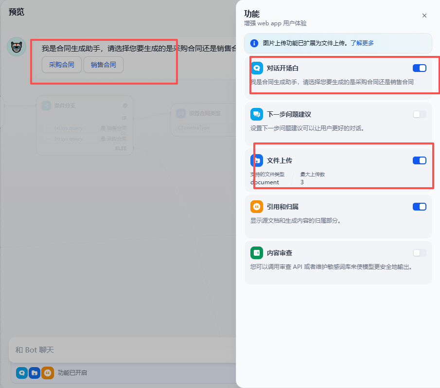上一篇内容以采购合同为例说明了各种需要前期准备的文档和开发环境,本篇内容则聚焦于实际功能Dify的节点开发,同时除了采购合同外,还添加了销售合同生成类型,用户需要通过对话框选择合同类型后,根据提示一步步生成相应的合同。