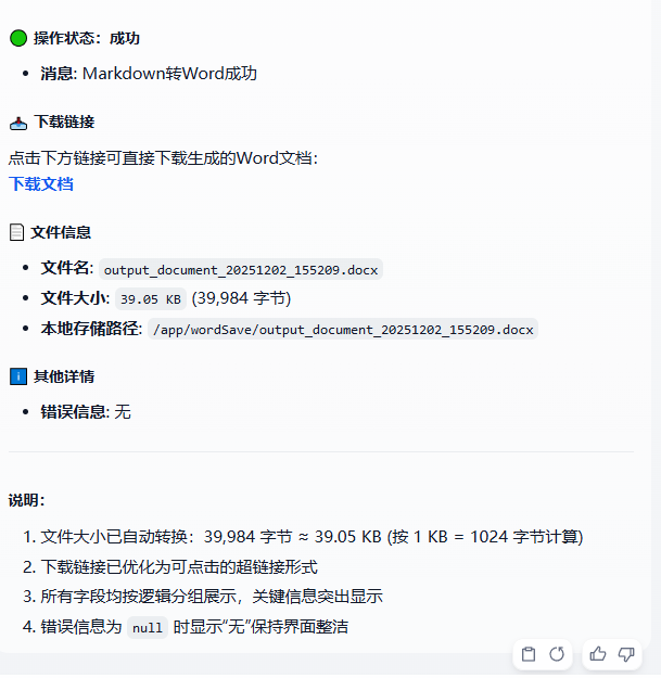 拼接的合同全文,通过http请求节点,调用python文档生成接口,生成word生成路径并返回,实现聊天框点击直接下载。