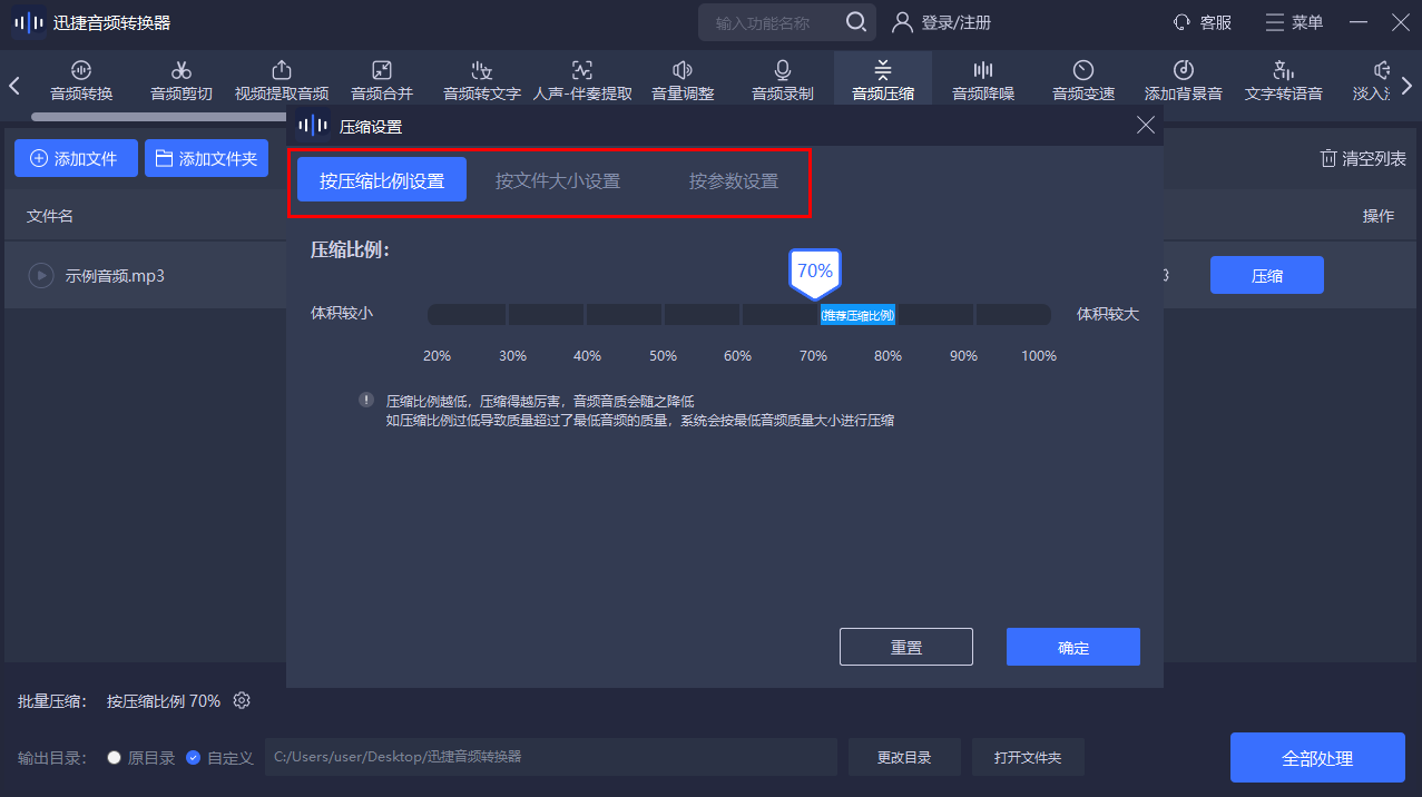 ✅ 智能压缩模式:提供“按压缩比例”、“按文件大小”等预设选项,自动优化文件大小和音质平衡。