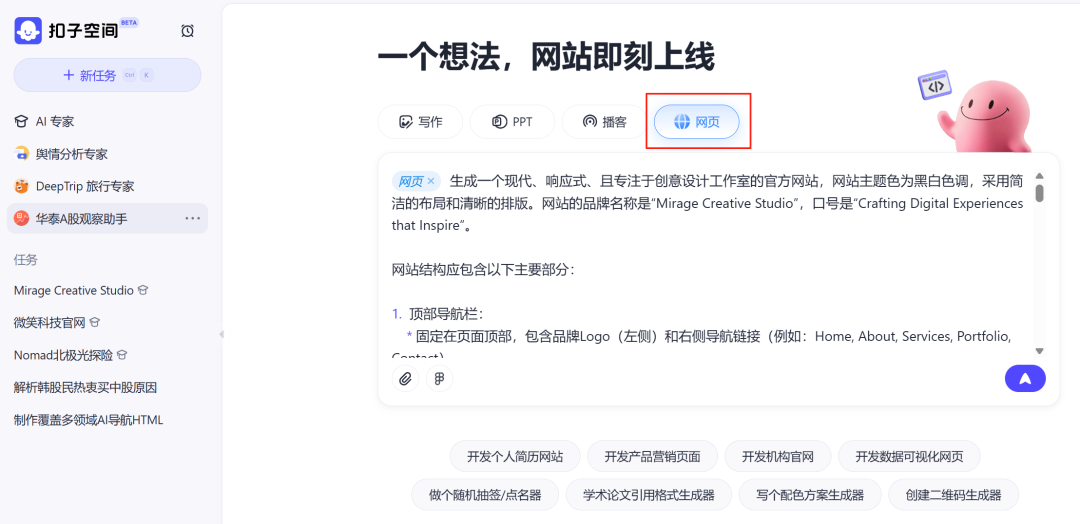 如今,「扣子空间」的【网站开发】功能,彻底颠覆了这一流程——三步实现“网站自由”: