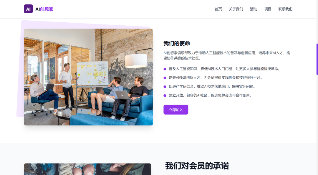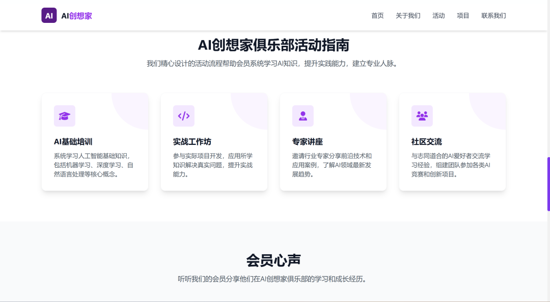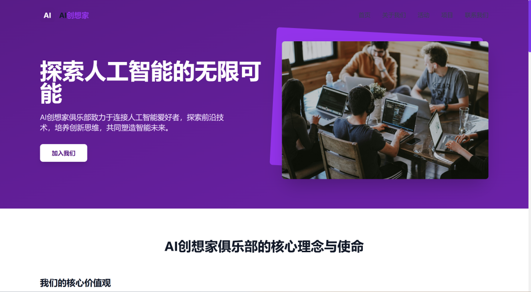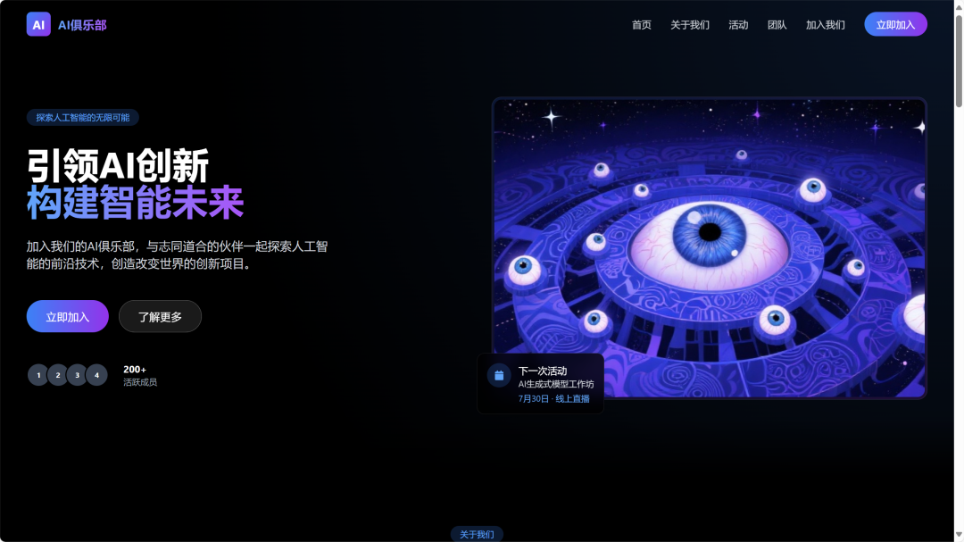 几分钟之后,AI 俱乐部的官网就出来了,给大家看看 AI 搞出来的 AI俱乐部官网长什么样。