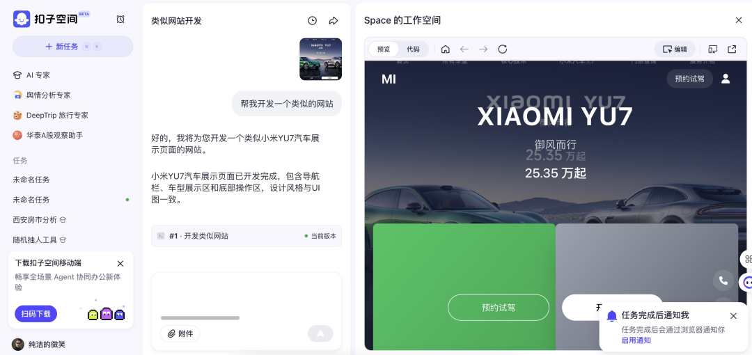比如,我直接把小米汽车的官网截个图,我就给扣子空间说,给我开发一个类似的网站。