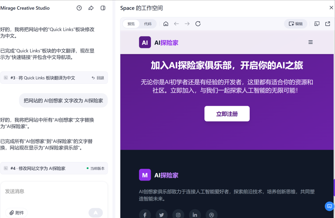 最左侧,是选择不同的 Agent 帮你去处理不同类型的任务,比如我们选择的就是网页开发的 Agent,其实它还支持很多其它类型。最右侧,区域就是代码生成的最终效果了,这块我重点跟大家介绍一下,细节决定产品成败,扣子空间所有点基本帮我们都考虑到了。中间区域,就是提示词输入区,就是我们要给它提要求,需求越具体生成的内容越精准,大家可以找一个好的提示词去修改即可。大家应该也能看出来,这里面最牛逼的不是它