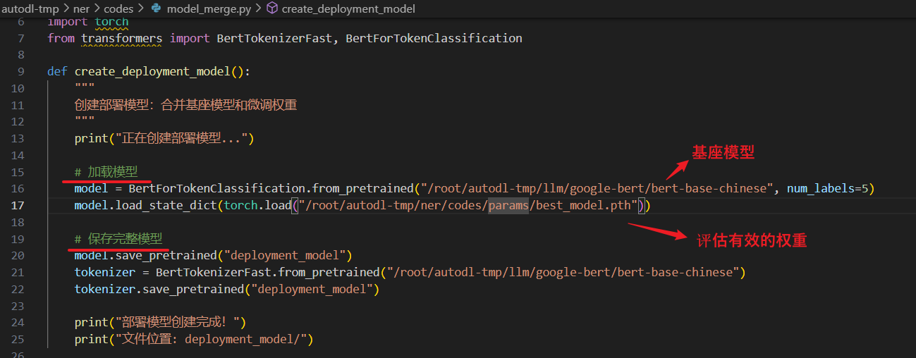 功能:将基座模型和微调权重合并为一个完整的模型
