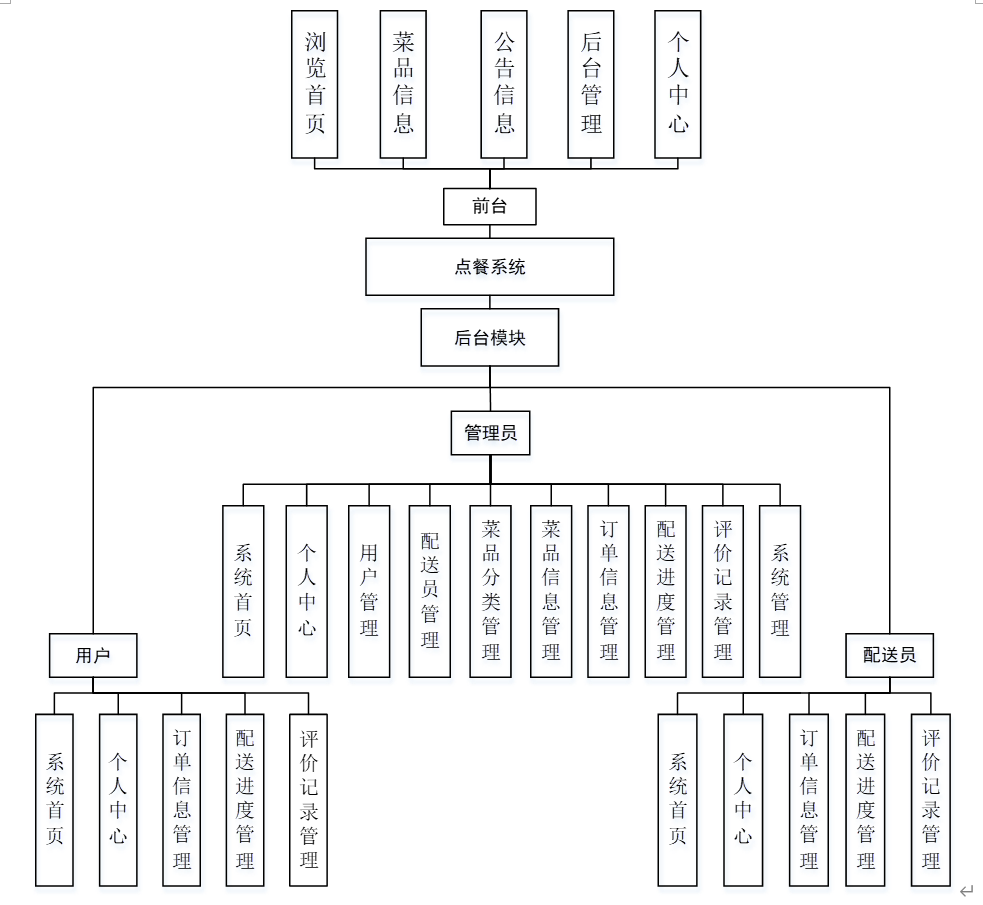 点餐系统的整体结构设计主要分为三大部分:管理员、用户和配送员。他们的权限不同,于是操作功能也有所不同。整体结构设计如图4-2所示。