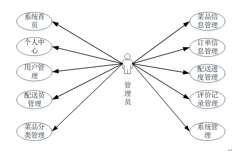 点餐系统的最大权限用户是管理员,通过管理员菜单中的用户、配送员、菜品分类、菜品信息、订单信息、配送进度、评价记录、系统信息进行管理。管理员用例如图3-8所示。