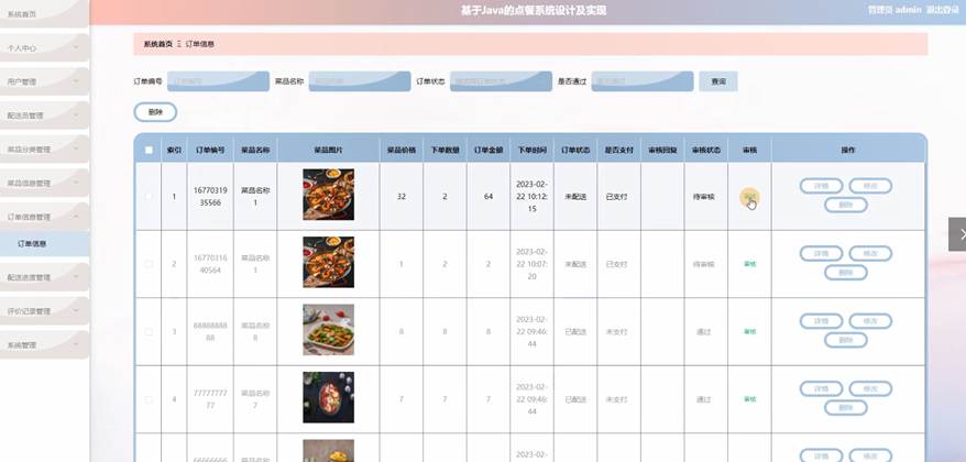 管理员点击订单信息管理;在订单信息管理页面通过对订单编号、菜品名称、菜品图片、菜品价格、下单数量、订单金额、下单时间、订单状态、是否支付、审核回复、审核状态、审核等信息,进行查询或删除订单信息等操作;如图5-6所示。
