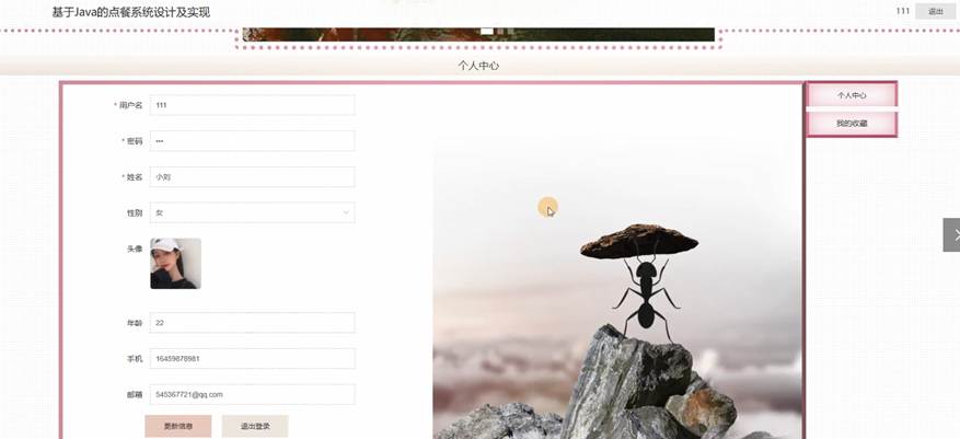 在个人中心页面可以输入个人详细信息,进行信息更新操作,还可以对我的收藏进行详细操作,如图5-15所示: