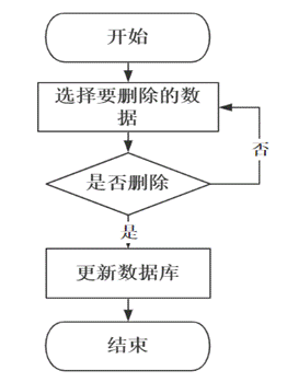 删除操作在系统中并非是必须的,可根据用户及系统的需要来决定是否添加删除功能,删除操作就是使用delete语句将数据库中的某一匹配数据删除,因为此操作会导致用户数据丢失,所以为了避免使用者误按删除键,应在用户点击删除按钮时添加一个提示确认弹窗,当用户确定要删除时,再进行数据库的操作,并且在删除操作完成后要对用户进行反馈。删除信息流程图如图3-6所示。