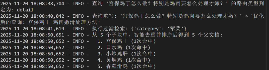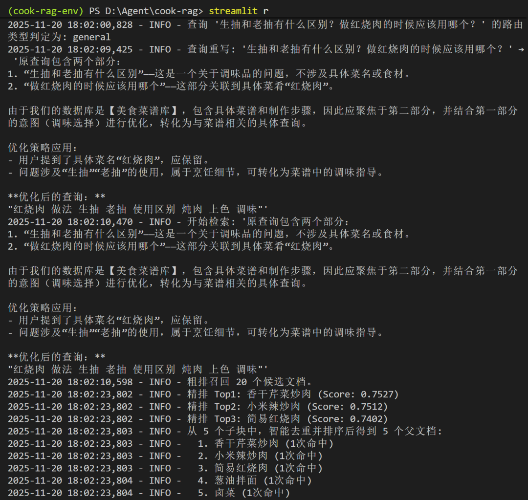 '红烧肉 做法 生抽 老抽 使用区别 炖肉 上色 调味',这极大地扩展了检索范围。 - 检索命中:日志显示命中了