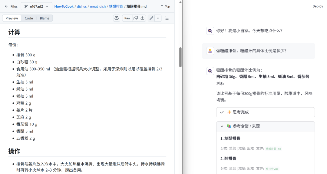 Detail(详情)模式。 - 检索与生成:精准定位到糖醋排骨文档中的用料部分,直接回答“白砂糖 30g、香醋 5ml、生抽 5ml…”,没有任何幻觉数据。