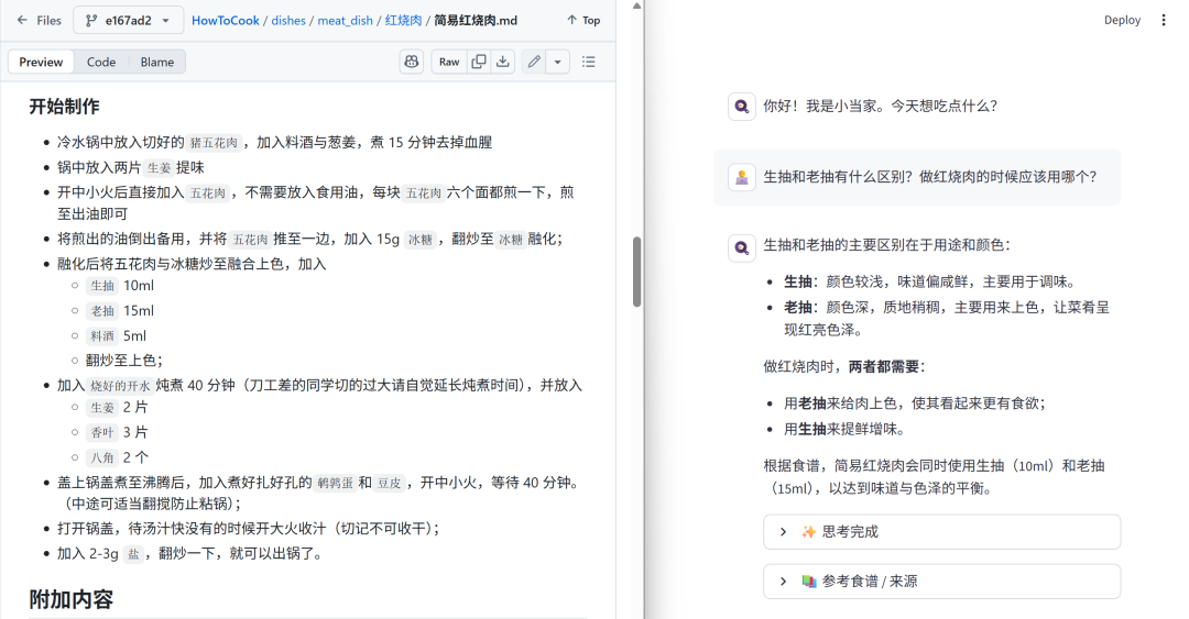 简易红烧肉、卤菜等相关文档。 - 生成回答:准确指出了生抽调味、老抽上色的区别,并结合红烧肉场景,建议两者配合使用。