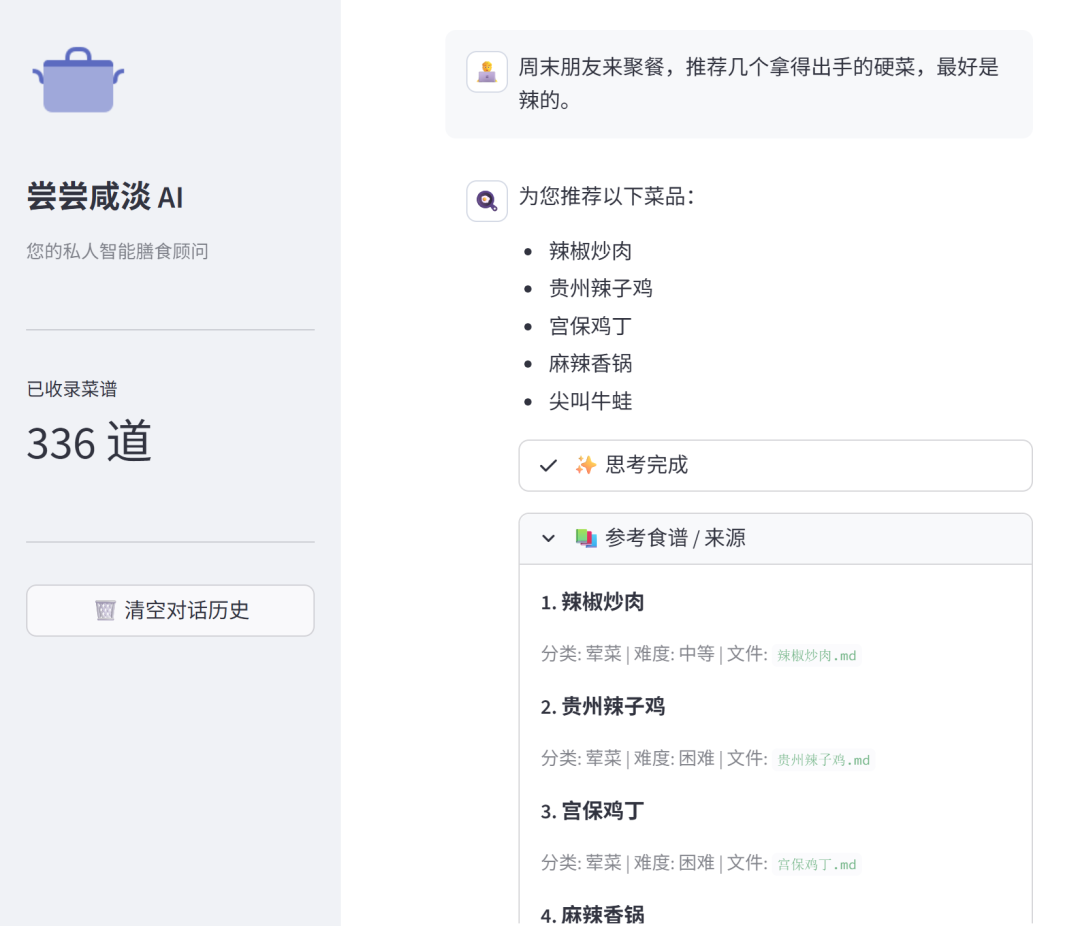 category: '荤菜'作为过滤条件,排除了辣味素菜或小吃。 - 最终推荐:推荐列表包括“辣椒炒肉”、“贵州辣子鸡”、“宫保鸡丁”、“麻辣香锅”——全都是符合“辣”且“硬(荤菜)”标准的菜品。