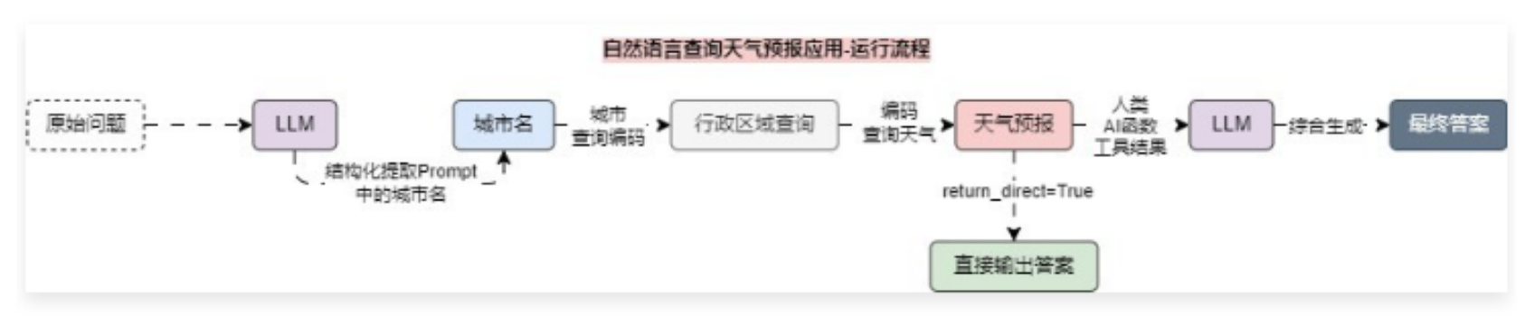所以要完成一个输入 城市名 查询天气预报的函数/工具,必须先调用 行政区域查询 将城市转换为城市编码,然后在利用城市编码调用 天气预报 接口,从而完成整个流程,如下
