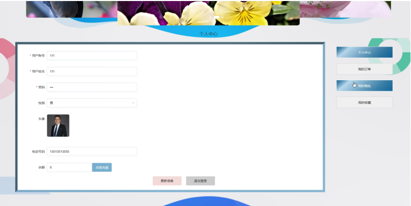 用户登录进入鲜花在线商城可以查看系统首页、个人中心等信息,进行相应操作,如图5-13所示。