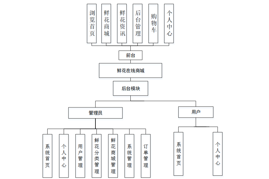 系统功能结构图是系统设计阶段,系统功能结构图只是这个阶段一个基础,整个系统的架构决定了系统的整体模式,是系统的根据。鲜花在线商城的整个设计结构如图4-1所示。