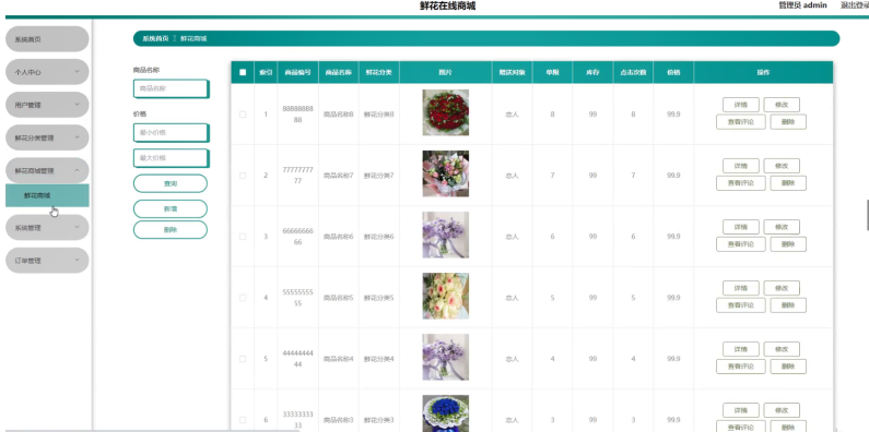 管理员点击鲜花商城管理;在鲜花商城管理页面中输入商品编号、商品名称、鲜花分类、图片、赠送对象、单限、库存、点击次数、价格等内容,进行查询、新增或者删除鲜花商城等操作;如图5-11所示。