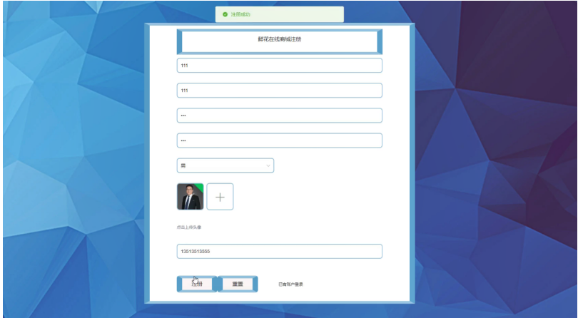 点击用户注册,用户通过注册页面填写用户管理、密码、确认密码、用户姓名、性别、头像、电话号码等信息,并点击注册操作,如图5-2所示。