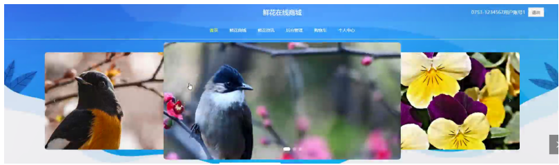 当游客打开系统的网址后,首先看到的就是首页界面。在这里,游客能够看到鲜花在线商城的导航条显示首页、鲜花商城、鲜花资讯、后台管理、购物车、个人中心等。系统首页界面如图5-1所示: