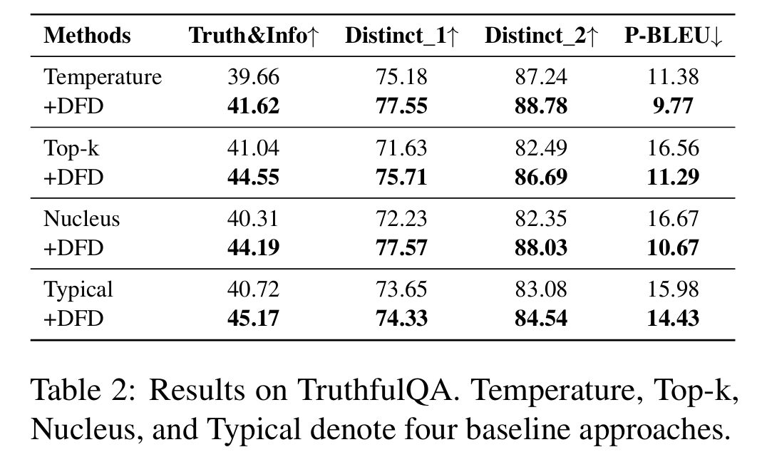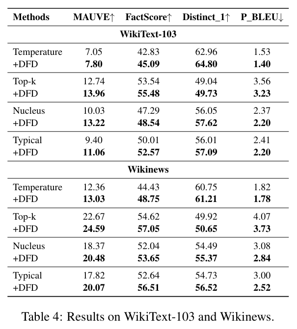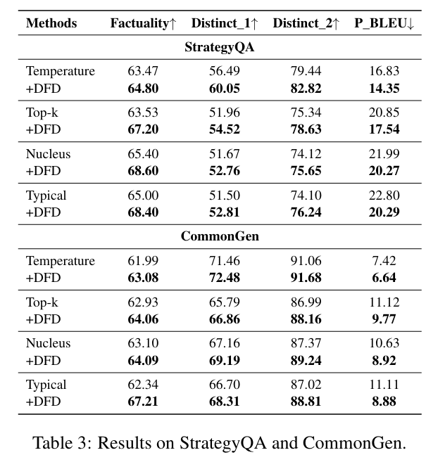 团队在多个开放式生成任务上验证了 DFD 的有效性。实验结果显示,DFD 在多种随机解码策略下均带来一致提升。