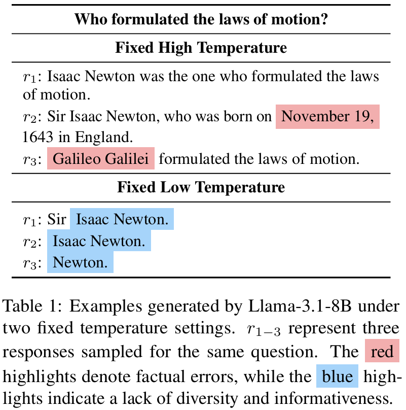 传统随机解码方法(如 top-k sampling、nucleus sampling)采用固定温度来控制输出多样性。温度一高,模型“脑洞大开”;温度一低,模型“循规蹈矩”。