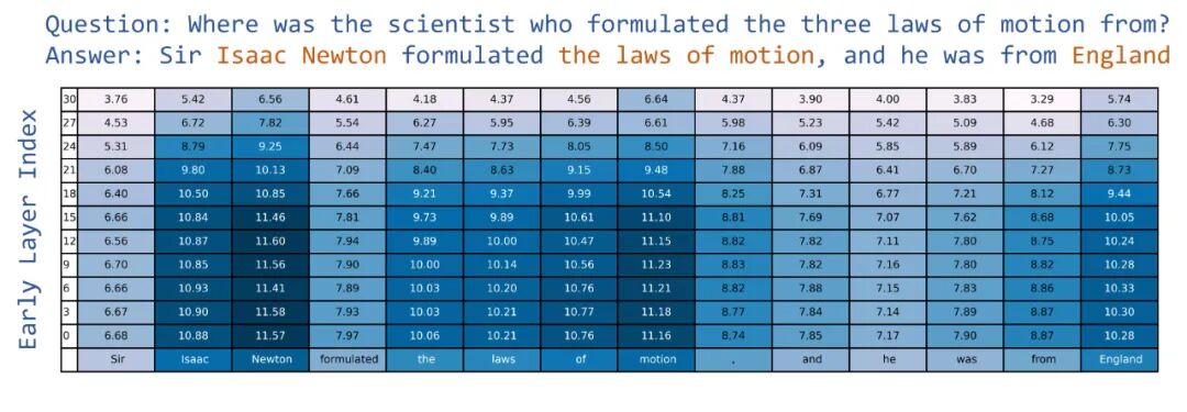 1. 相比描述性或创造性的内容,依赖事实知识的生成步骤(如实体名“Isaac Newton”)在层间通常有更高的 KL 散度。