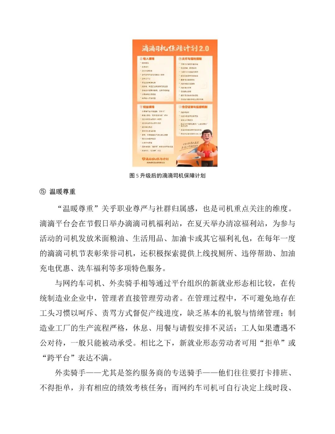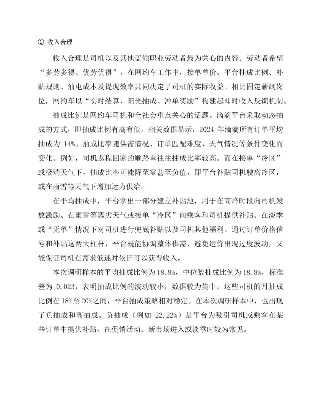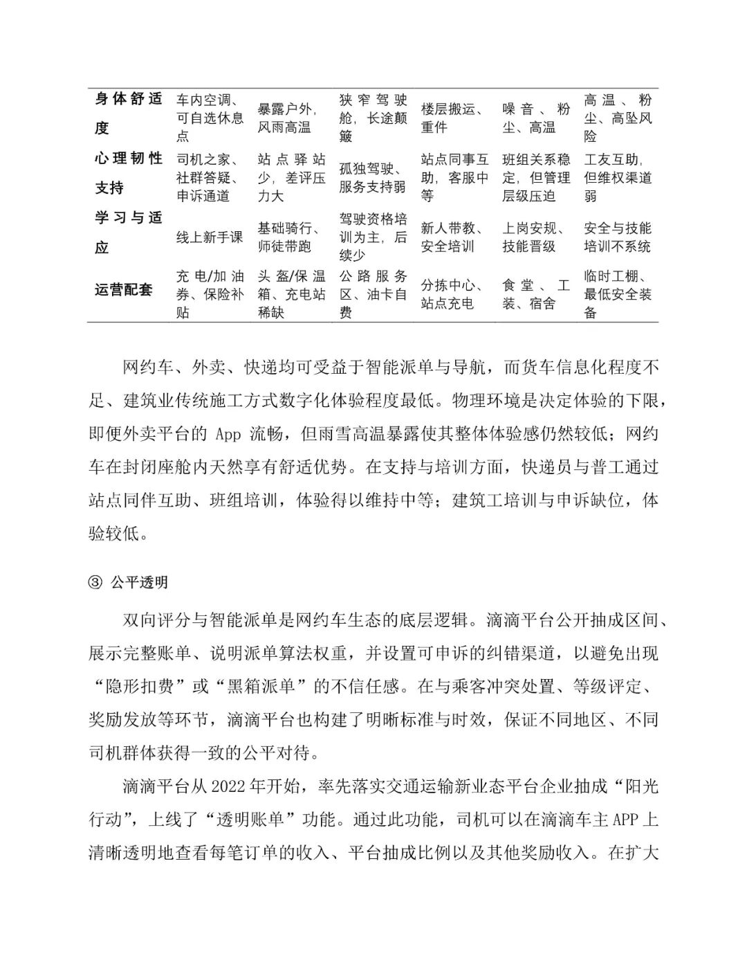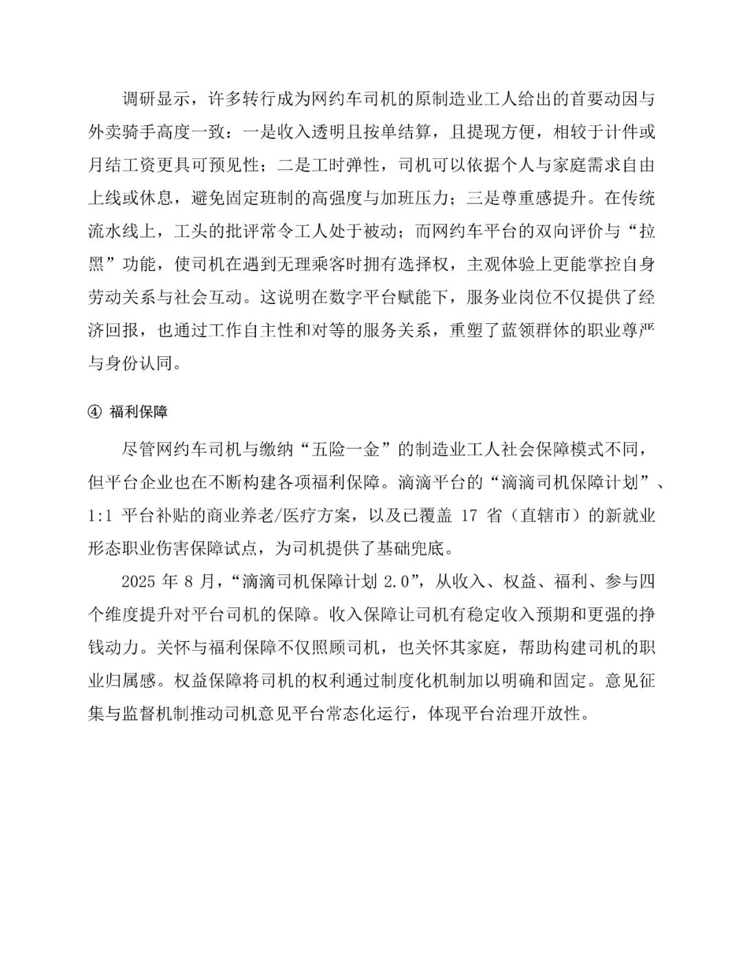 以滴滴为例,平台在收入保障、安全健康、职业发展等方面持续投入。推出免佣活动、高温补贴等激励措施,构建全流程安全管理体系,累计投入数十亿元用于安全保障,并提供职业培训与公益帮扶项目。司机对支付系统(满意度70.2%)和安全培训(满意度60.4%)认可度较高,但受市场供需波动影响,对补贴力度和派单机制满意度存在起伏。同时,平台通过精准运力调度、拓展长尾服务场景、集中采购降低运营成本等方式,创造显著的社会福利净增量。