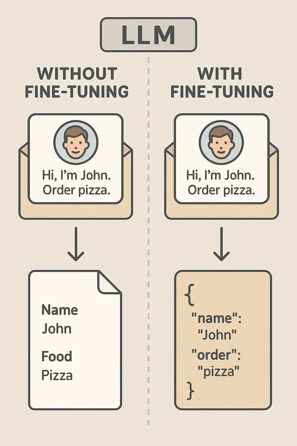 用 100 封邮件例子训练。现在它总会输出 JSON 格式:{"name": "John", "order": "pizza"}。