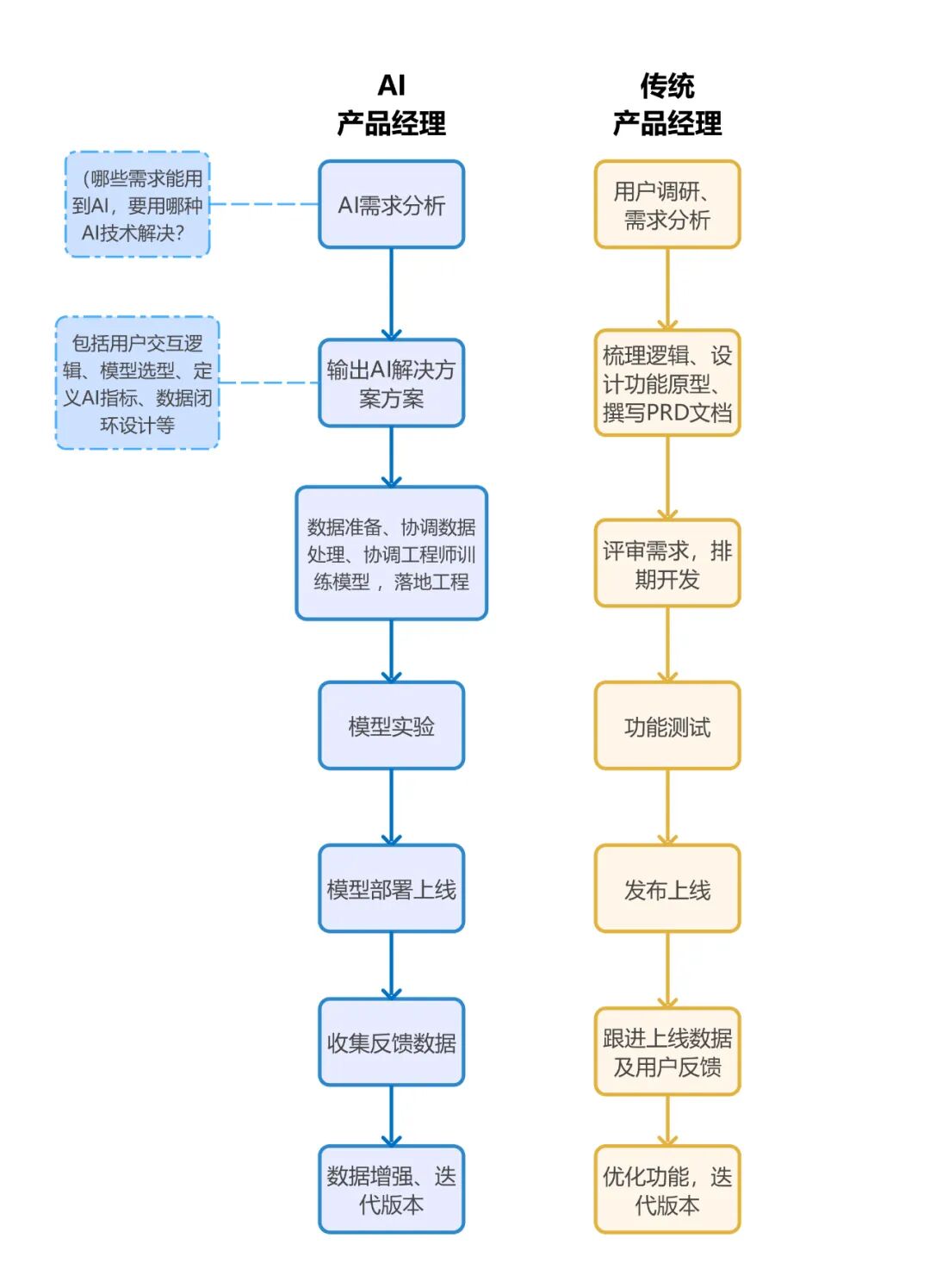 传统产品经理聚焦于功能逻辑设计与产品流程优化,以用户需求和业务目标为核心推动产品迭代;