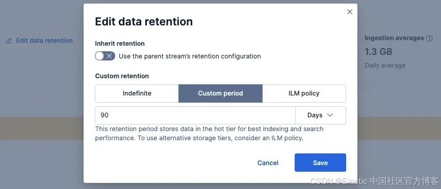 点击 “Edit data retention” 会打开一个模态窗口,允许你更新流的配置。从这里你可以更新 ILM 策略,或通过 DSL 设置自定义保留周期。