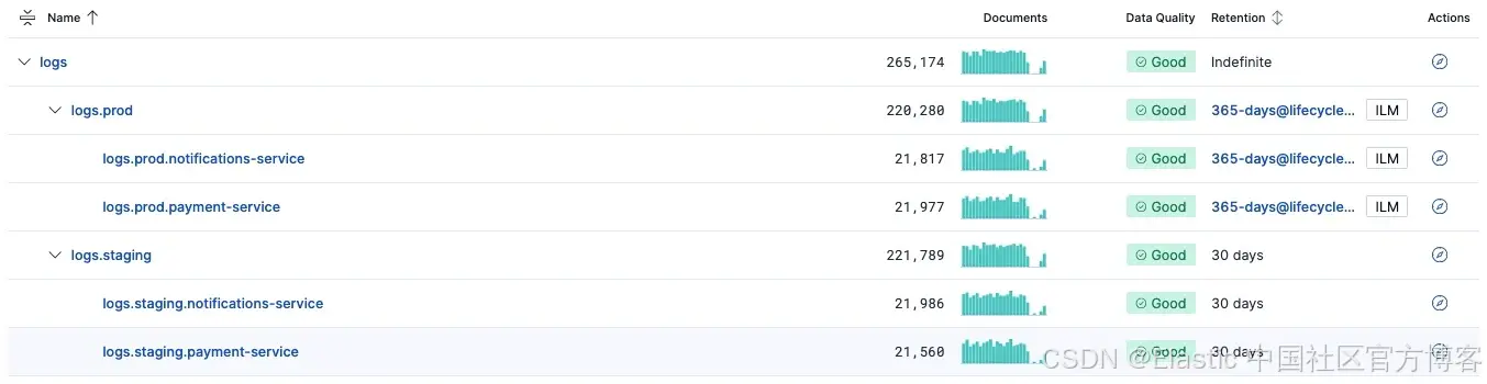 当 ILM 策略生效时,保留视图变得更具可视化效果。Streams 显示各阶段(hot、warm、cold、frozen)的数据量分布,让你清晰了解数据在存储层级中的分布情况,以及生命周期是否按预期运行。