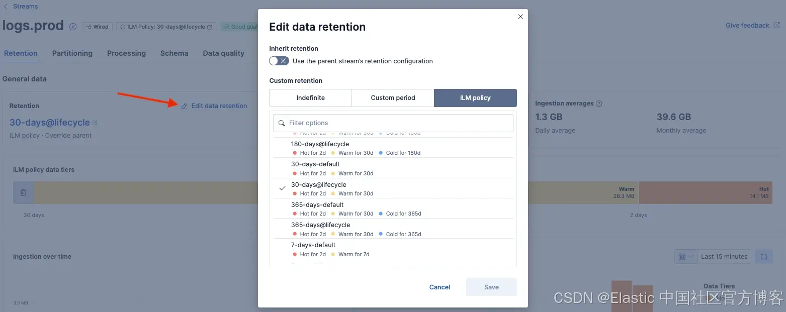 使用 Streams,保留管理变得清晰且一致。你可以可视化数据摄取,在 DSL 和 ILM 之间切换,或在流之间继承策略,而无需深入模板或手动设置索引。