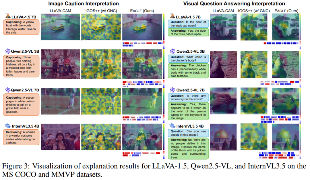 相比基于梯度的可解释方法(如 IGOS++、Grad-CAM), EAGLE 显存占用减少约 70%~80%, 在 Qwen2.5-VL 7B 上运行仅需。这意味着即使模型答对了,我们也不知道它是“真懂”还是“瞎蒙”。给多模态大模型装上了“显微镜”, 让我们第一次能看清:每一个词,是看图得出的,还是靠想象写出来的。—— 不知道生成内容到底是“看图得出的”还是“语言模型自己编的”。: 找出“最少的一