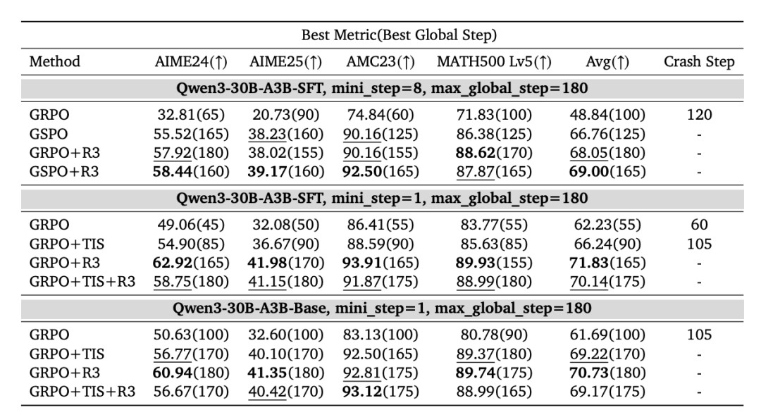 在多mini-step设置下,GRPO+R3的表现比GSPO高出1.29分。