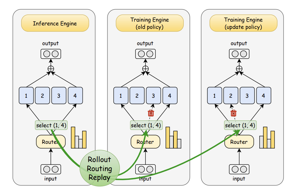 他们的做法是:在推理时把路由分布记录下来,等到训练时再把这些分布原封不动地“重放”进去。