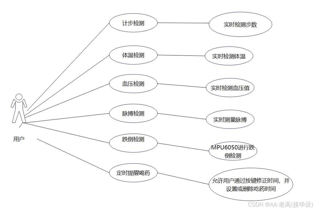 (1)实时健康监测:系统能够实时获取并监测患者的健康数据,包括体温、血压、脉搏、运动量等。通过集成传感器(如脉搏检测模块、血压计、红外测温模块、MPU6050计步模块),系统可以定期自动记录并显示患者的健康数据,确保及时发现异常。