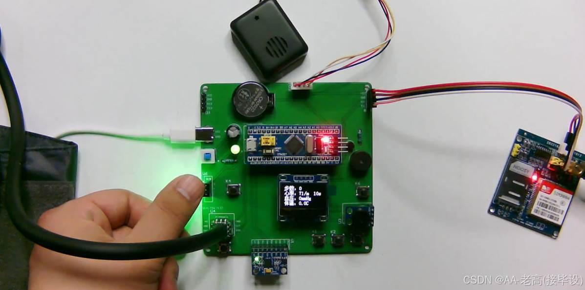 (4)健康数据阈值设置与报警:系统允许医护人员或患者设置个性化的健康数据阈值(如脉搏上下限、血压上下限、体温范围等)。当监测到的健康数据超出预设范围时,系统会自动发出语音提示,并通过GSM模块发送短信警告,确保患者的健康得到及时关注。