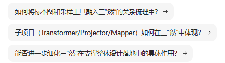 另外,用户之前提到过标本图、采样工具,还有子项目(Transformer/Projector/Mapper),需要把这些元素融入进去,确保不脱节。最后总结三者如何支撑整体设计的落地,从现实基础到测度验证,再到理想目标,确保设计可行且有价值。>>
